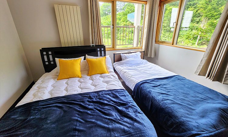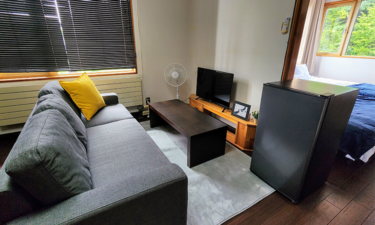 16畳の洋室です。定員3名。ダブルベッドが1つとシングルベッドが1つのお部屋です。広めの部屋でくつろげるソファもあり、ゆっくり滞在したい方や長期滞在にもぴったりです。お部屋内に冷蔵庫、タオル、ドライヤーのご用意があります。